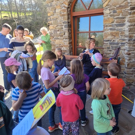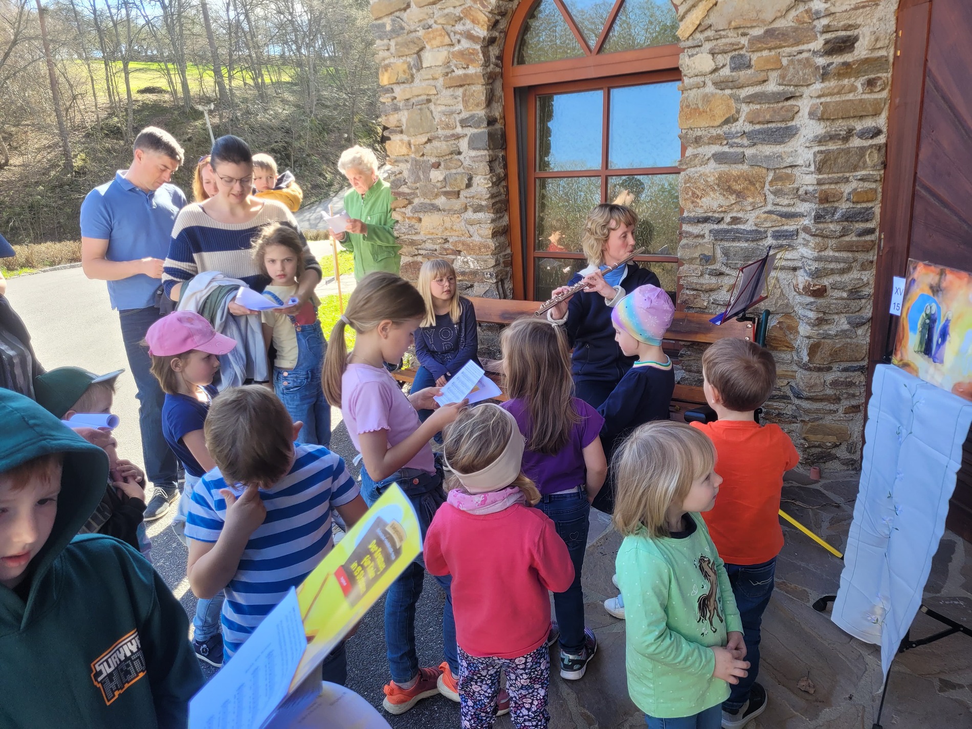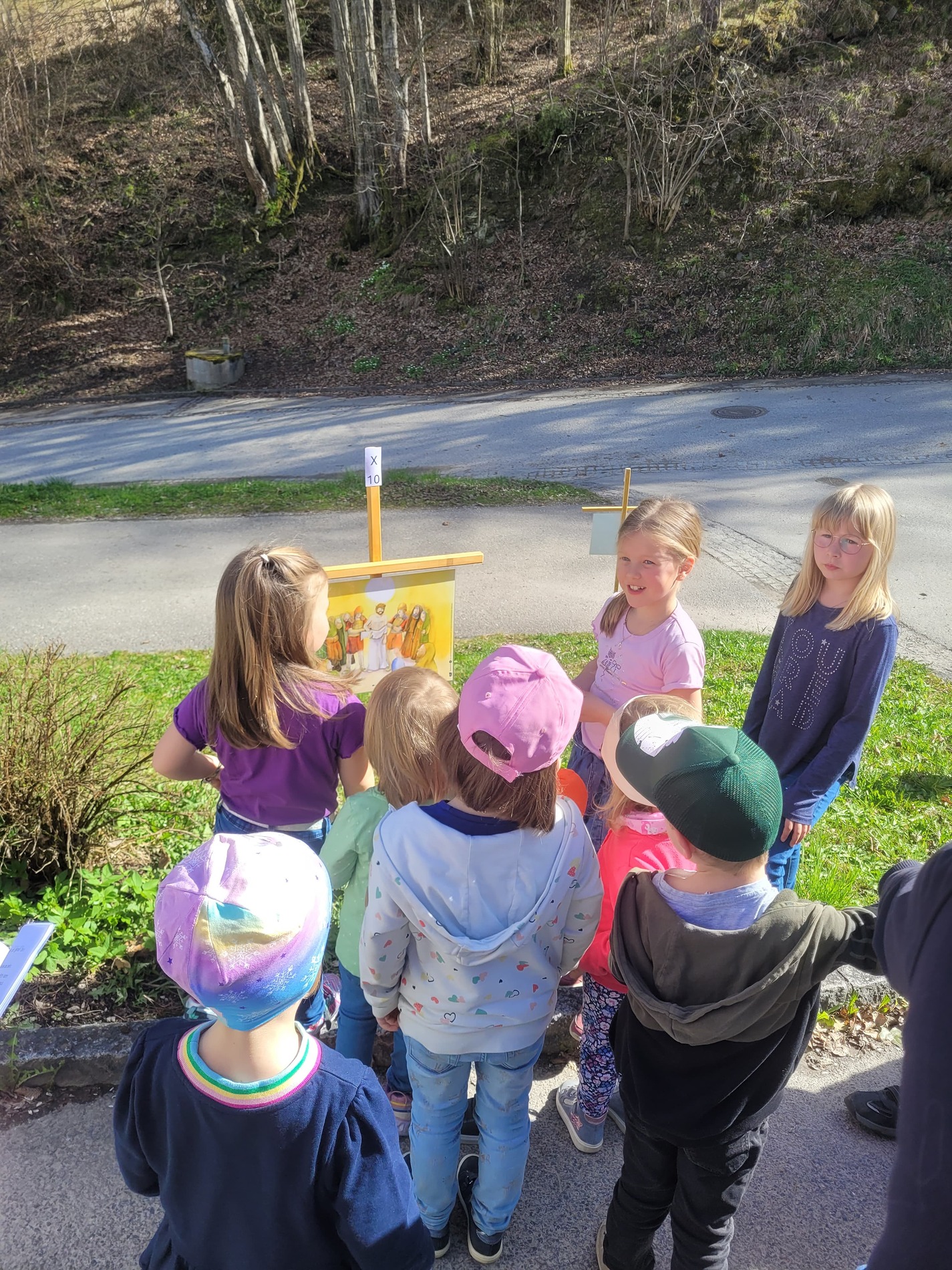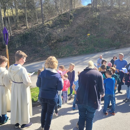 Bei strahlendem Sonnenschein konnte eine große Schar Kinder den Kreuzweg am Kirchenweg entlanggehen.